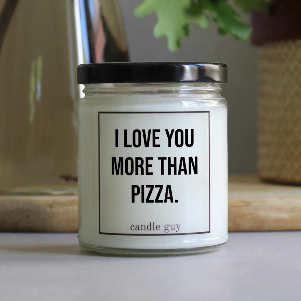 Die Spruch Kerze "I love you more than pizza." brennt ultralange und duftet himmlisch – das perfekte Geschenk für dich oder andere.