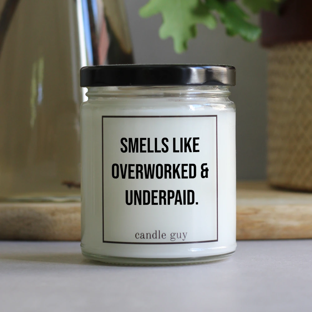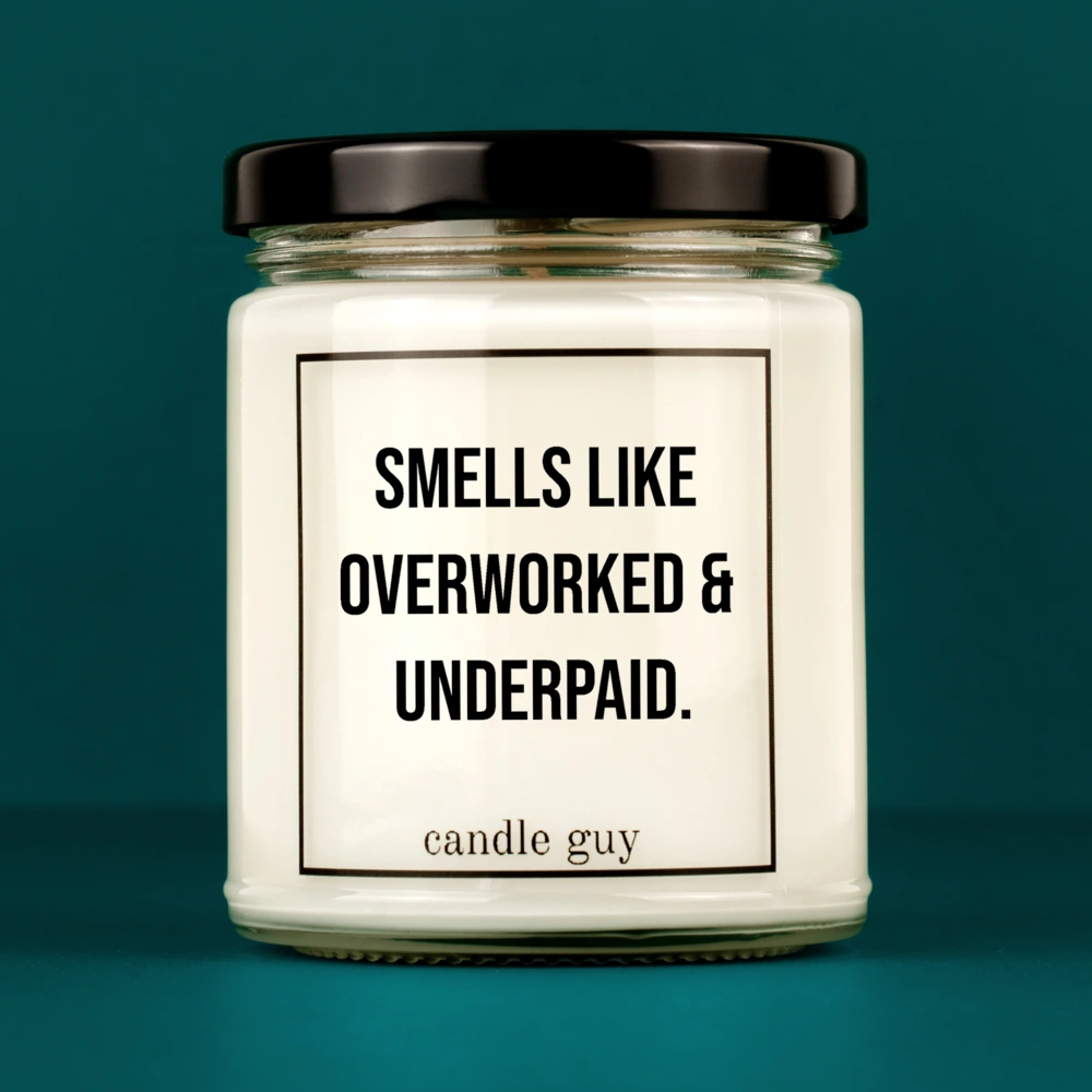 Die Spruch Kerze "Smells like overworked and underpaid." brennt ultralange und duftet himmlisch – das perfekte Geschenk für dich oder andere.